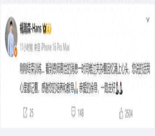 正在美国备战NBA季前赛的杨瀚森训练结束后看到消息,在社交媒体上发文:“刚刚结束训练……看到恩师离世的消息一时间难过夹杂着回忆涌上心头,您说的话我心里都记着,感谢您的培养和教导。亲爱的徐导,一路走好。”